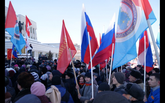 В Омске у библиотеки имени Пушкина прошел митинг в поддержку Крыма и русскоязычных жителей Украины. Митингующие, которых, по оценкам полиции, собралось около 4 тысяч, приняли резолюцию о согласии на ввод российских войск на Украину.