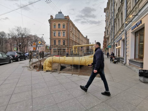 Через квартал от Невской Ратуши, на углу 9-ой Советский и Кирилловской разрыта траншея. Люди пишут, что эти баррикады тут уже два года. Информационная табличка гласит, что объект на реконструкции и срок окончания работ - май 2021. Но очевидно, что воздушная теплотрасса так и останется воздушной. Исторический облик города нарушен.