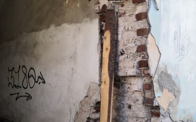 Нужно отметить, что кое-какие преобразования на месте разрушающейся конструкции произошли: жители дома, не дождавшись от Администрации никакой помощи, установили деревянную доску, которая теперь и подпирает стену. Также, по словам местных жителей, фасад им предложили отремонтировать самостоятельно, скинувшись домом. Управляющей компании здесь нет.